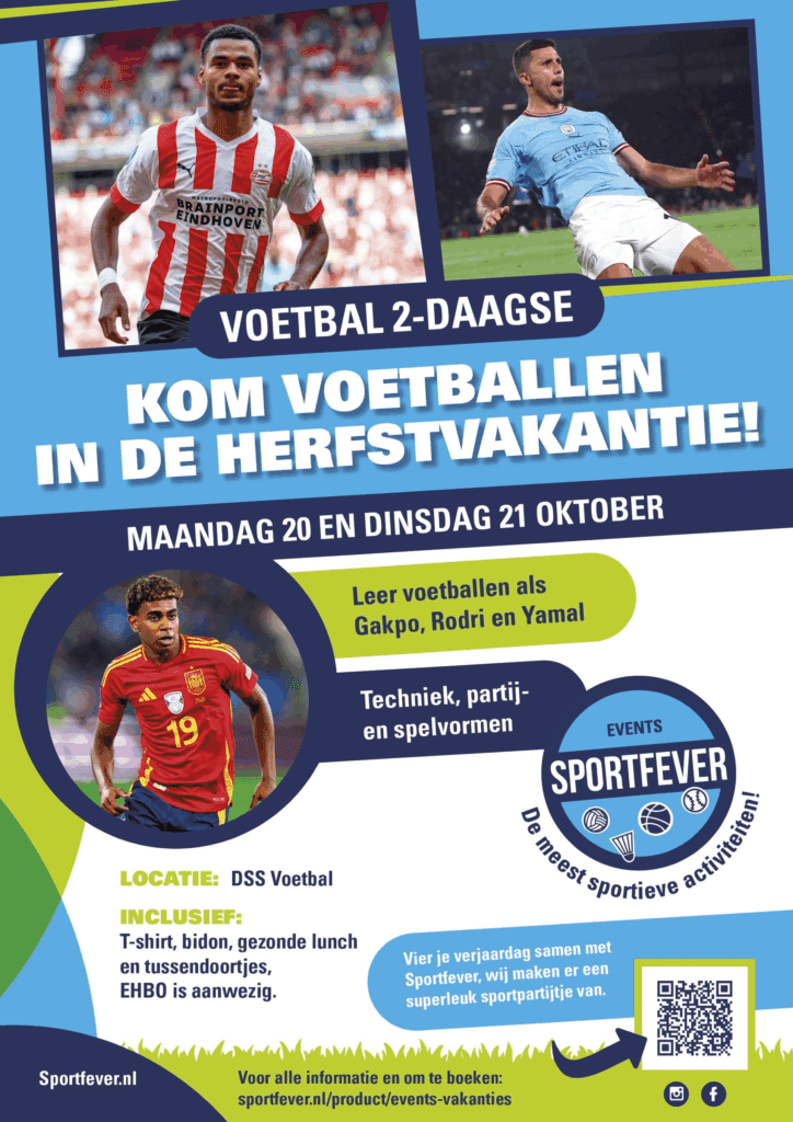 In de herfstvakantie organiseert Sportfever weer een voetbalkamp 2 daagse voor kinderen vanaf 6 jaar tot 13 jaar.Wij vinden het belangrijk dat kinderen minder tijd achter de tv of computer doorbrengen en in beweging komen. Tijdens ons kamp leren de kinderen nieuwe moves en vele voetbalskills. Ook kinderen die niet op voetbal zitten kunnen kennismaken met de sport.