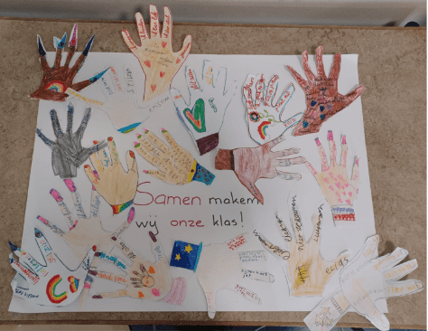 Om de regels goed te onthouden, hangen ze in de groep. Maar belangrijker is het handenbord. Ze hebben allemaal hun eigen hand gemaakt, met op elke vinger een doel waar zij zelf aan gaan werken om er een fijne groep van te maken. Het is hun handtekening voor de gemaakte afspraken. Je moet je er nu dus echt aan gaan houden.