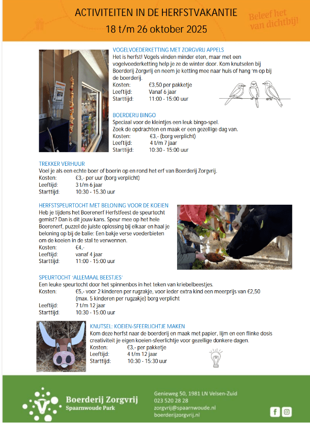 De herfstvakantie komt er weer aan en op Boerderij Zorgvrij is er in deze periode weer van alles te doen. Er is o.a. een knutselactiviteit, of een speurtocht waarbij de kinderen aan het eind de koeien voederbieten kunnen voeren. Meer informatie vindt u in de flyer hieronder!