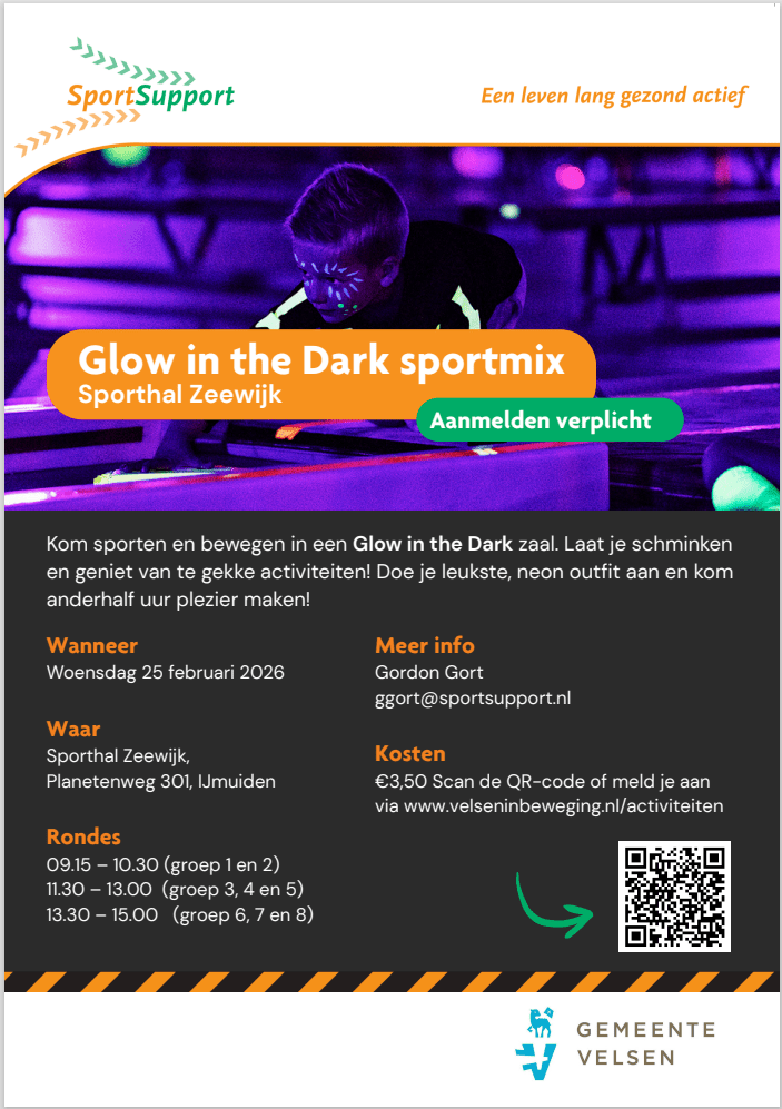 Sporten en bewegen in een Glow in the Dark zaal! Kom gezellig sporten en geniet van te gekke activiteiten! Doe je leukste neon outfit aan, laat je schminken en kom bewegen en plezier maken.