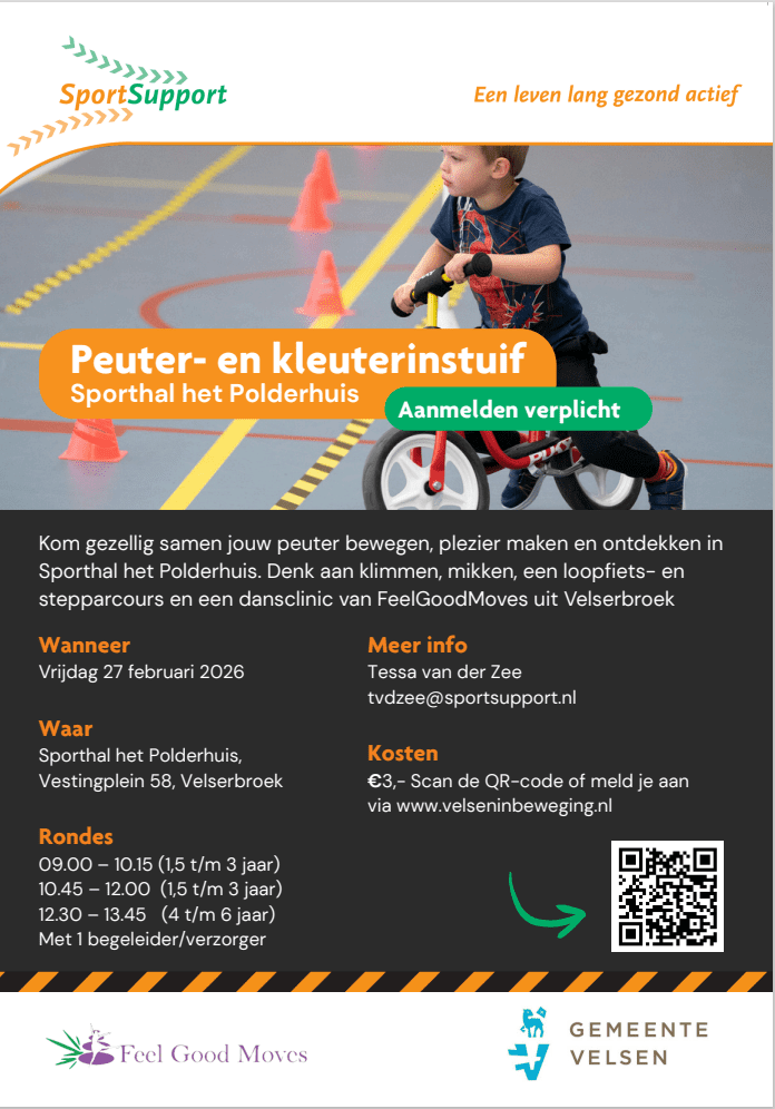 Kom samen met uw peuter en/of kleuter bewegen en plezier maken tijdens de instuif op vrijdag 27 februari in Sporthal het Polderhuis Velserbroek. Er zijn zes verschillende onderdelen waar je in groepjes langsgaat. Denk aan een springkussen, klim- en klauterparcours, loopfiets/step parcours en nog veel meer. Dansstudio FeelGoodMoves promoot in hun eigen dansstudio in het Polderhuis een onderdeel bewegen op muziek. Meld je snel aan op www.velseninbeweging.nl.